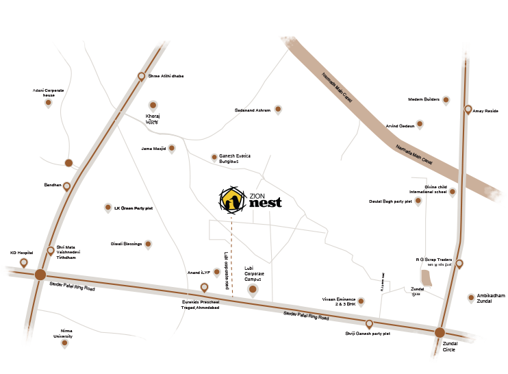 The towers of Zion Nest stand tall in Tragad, in the vicinity of SP Ring Road and SG Highway. Corporate offices, restaurants, malls, hospitals, and the city of Gandhinagar are also nearby the nests.