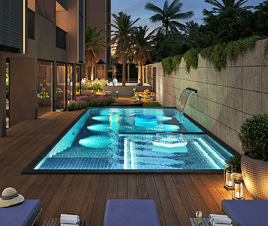 The 3-side-open towers have 14 floors each, separated by a vast green courtyard with a lily pond. A trellis-covered sitting space, a banquet hall, and a CCTV surveillance system complement facilities like a children’s play area, a swimming pool, an indoor games court, and a gymnasium.